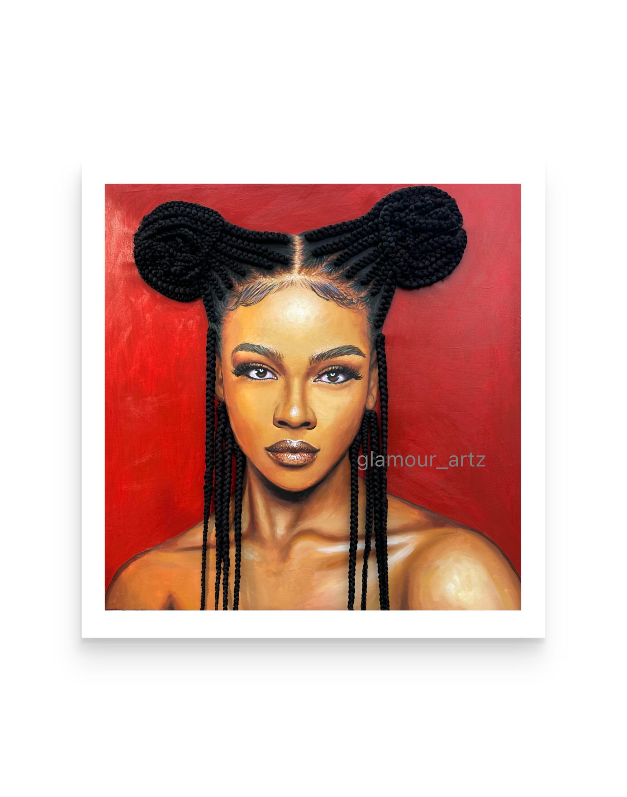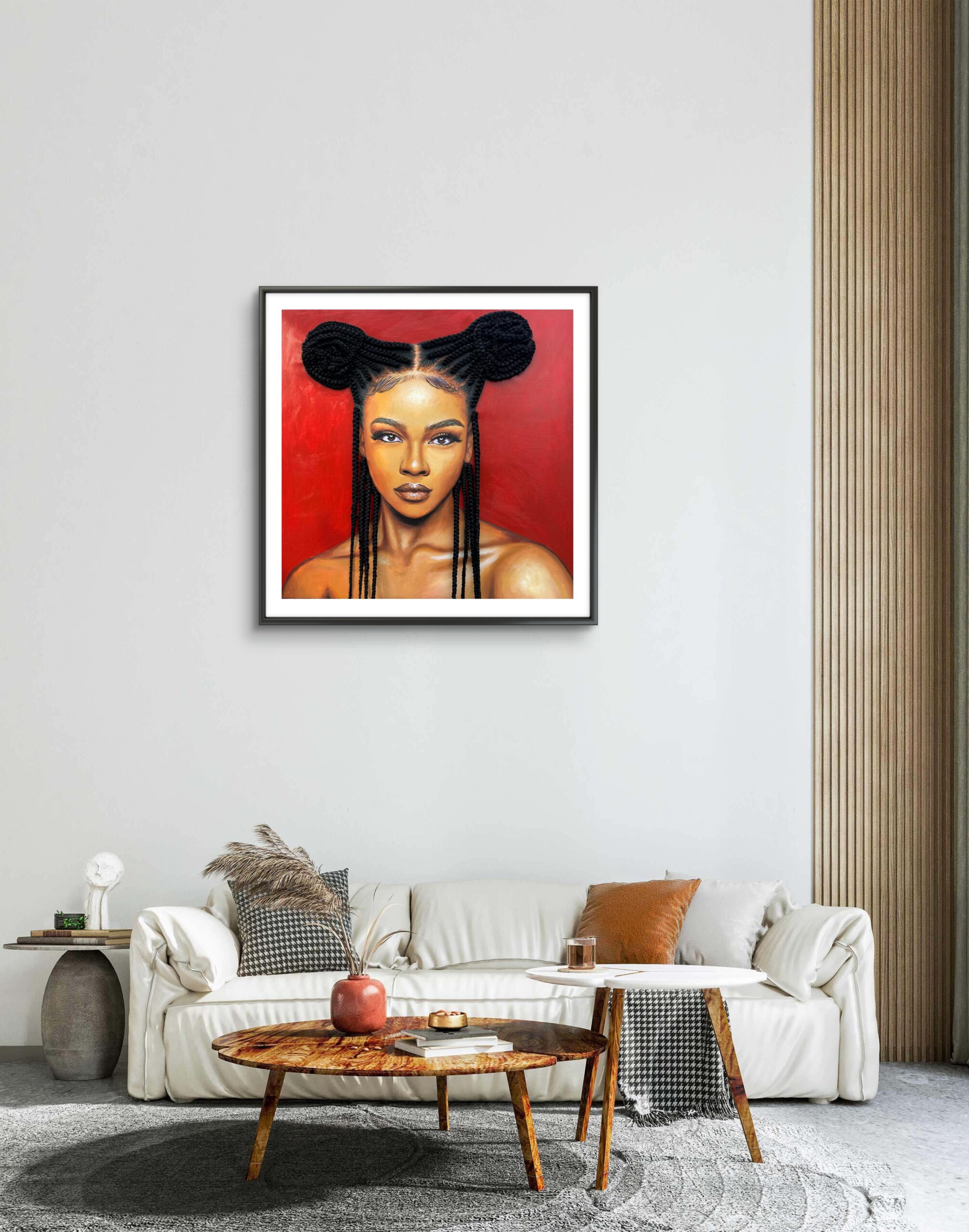 In the original mixed-media piece, braided hair moves beyond the canvas, transforming portraiture into sculpture. The crown is not ornamental; it is architectural — carrying memory, lineage, and presence.